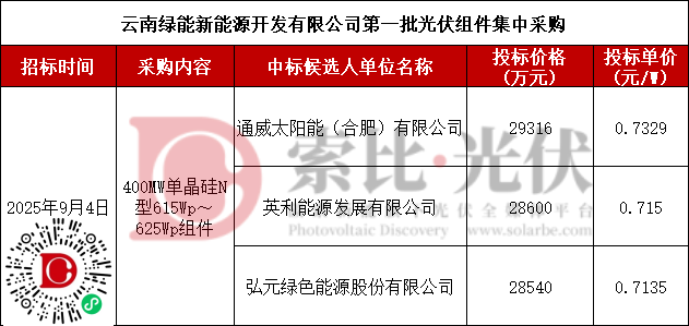 9月30日,云南绿能新能源开发有限公司第一批光伏组件集中采购候选人公示,本次采购预估采购安装总容量400MWp。