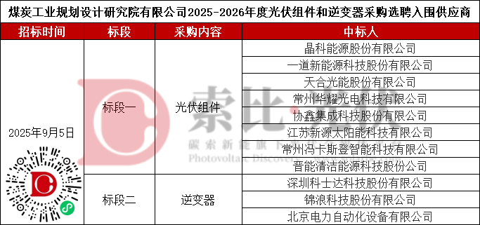 10月8日,煤炭工业规划设计研究院有限公司2025-2026年度光伏组件和逆变器采购选聘入围供应商采购中标公示。