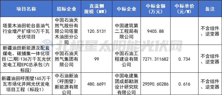 中石油三个定标项目均位于新疆,除中国建筑集团、中国电建外,中石油旗下企业亦中标。