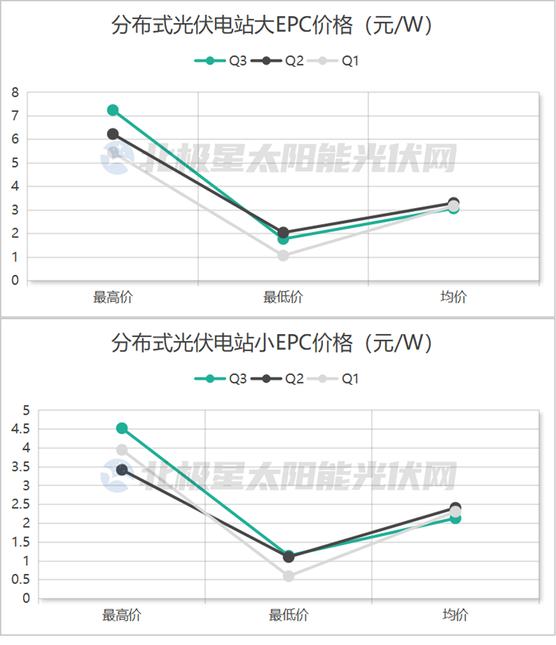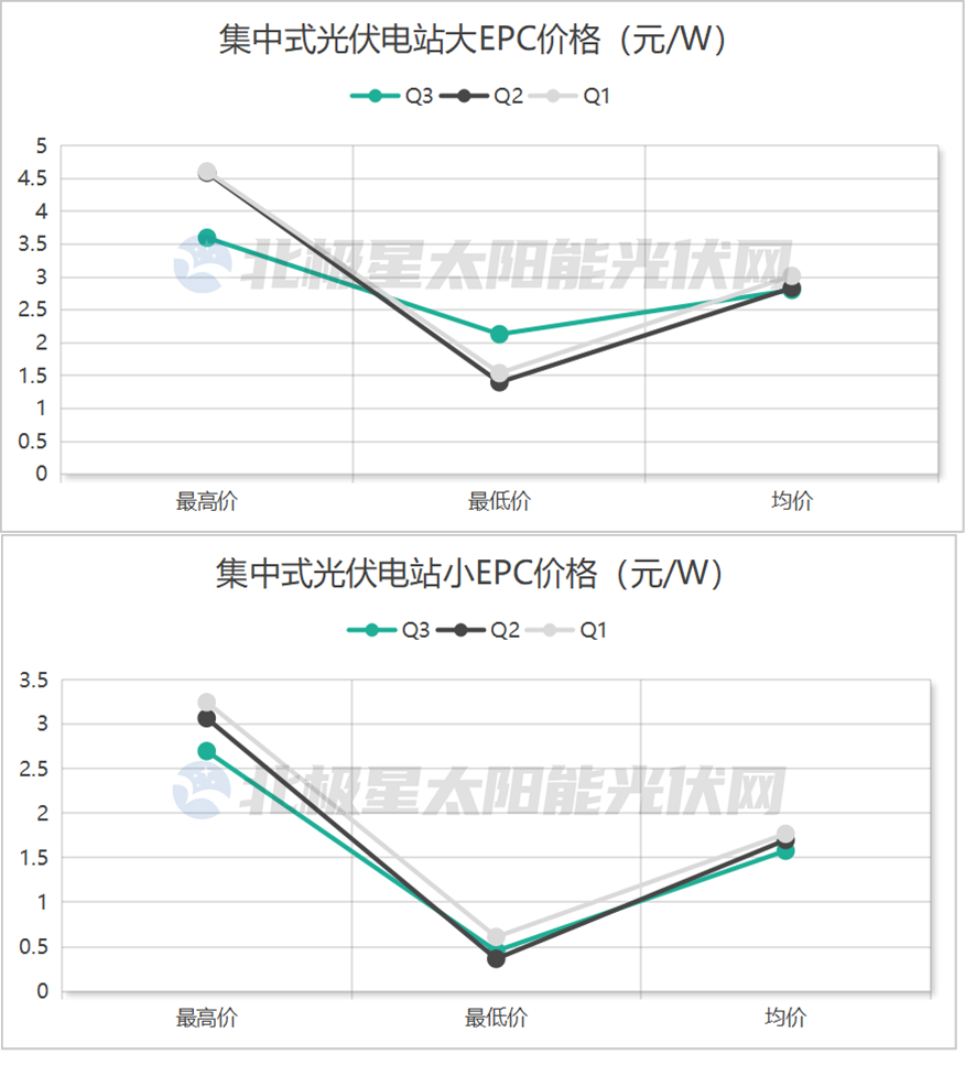 价格方面,集中式电站项目,就统计数据来看,无论是大EPC还是小EPC项目,与前两季度相比,最高价、均价双双下滑。