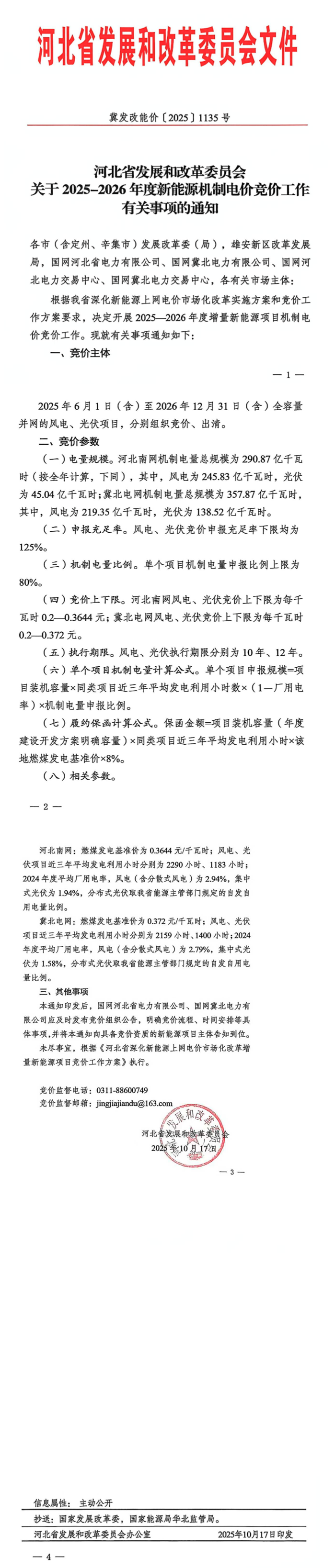 10月20日,河北省发展和改革委员会发布关于2025-2026年度新能源机制电价竞价工作有关事项的通知,通知指出,2025年6月1日(含)至2026年12月31日(含)全容量并网的风电、光伏项目,分别组织竞价、出清。