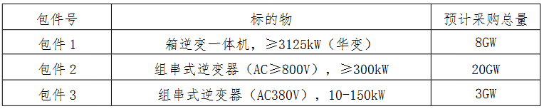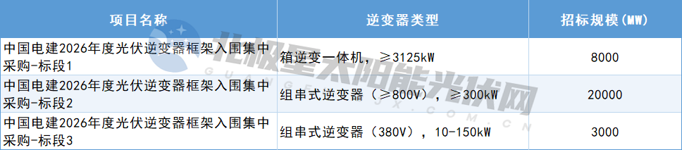 从中国电建阳光采购网官网获悉,12月3日,中国电建2026年度光伏逆变器框架入围集中采购发布,招标公告显示,采购箱逆变一体机、组串式逆变器,总规模达到31GW,分三个包件,详情如下: