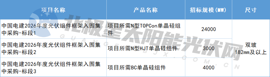 从中国电建阳光采购网官网获悉,12月3日,中国电建2026年度光伏组件框架入围集中采购项目公开招标公告发布,本次招标分为3个包件,采购TOPCon、HJT、BC组件,共计31GW,详情如下: